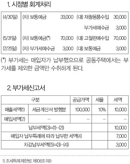 공동주택의 경우에는 승강기 교체 시 발생하는 고철을 판매하는 경우 이러한 제도의 적용대상이 될 수 있는데 다음의 예시를 통해 부가가치세 매입자 납부특례제도가 적용되는 경우의 회계처리와 부가세신고서 작성에 관해 살펴보도록 하자. 공동주택에서는 4월 30일 재활용품수입 3만3000원(VAT 포함)과 5월 31일 고철판매수입 7만7000(VAT 포함)이 발생했으며 7월 25일에 관련 부가세를 납부한 경우 시점별 회계처리와 부가세신고서는 다음과 같게 된다.
